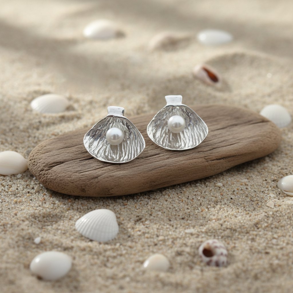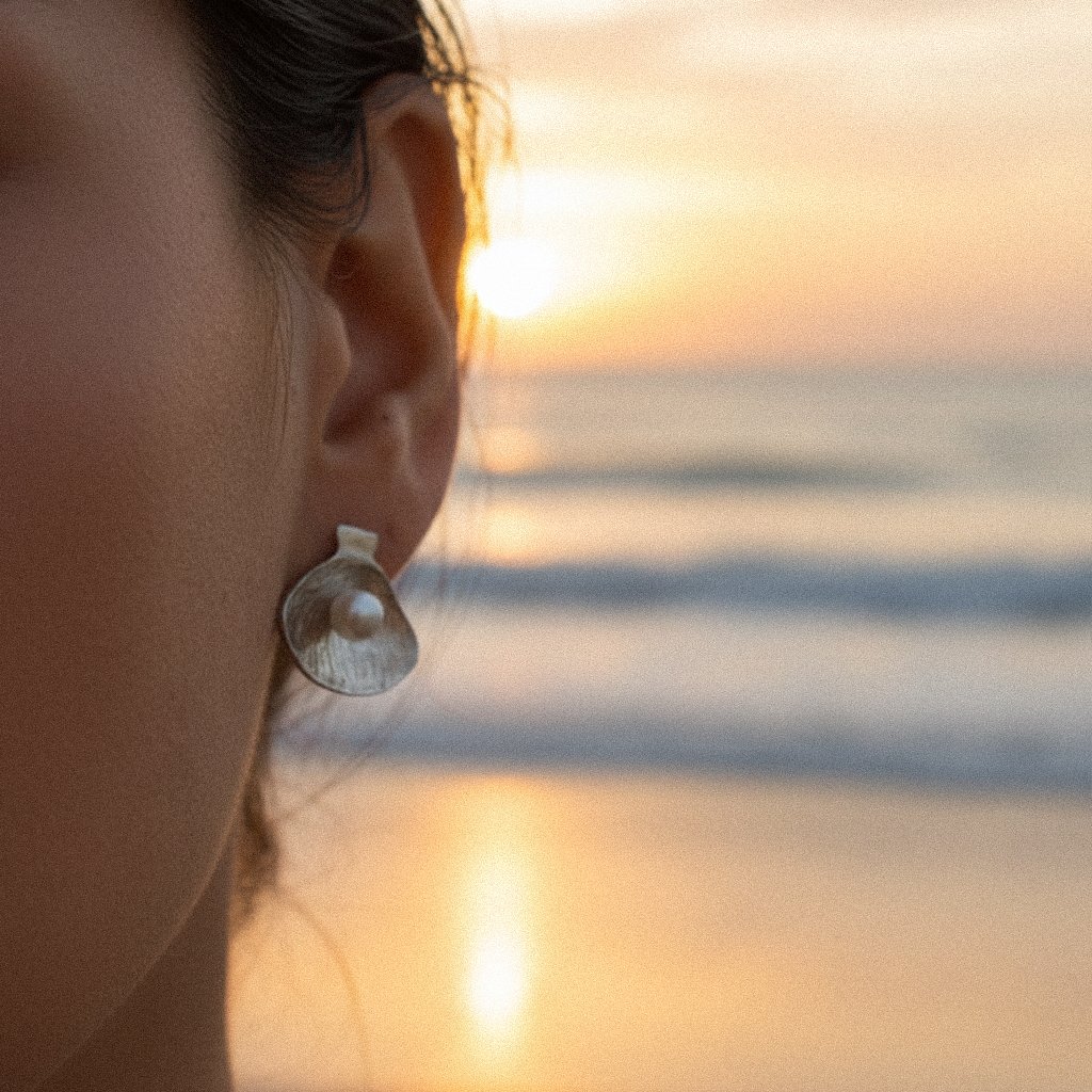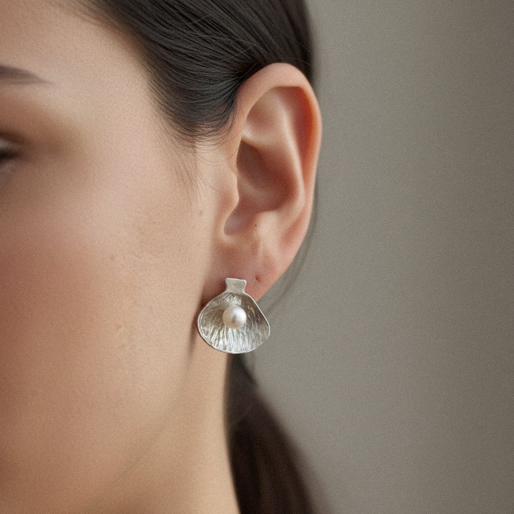 Pendientes en plata de ley 925 con baño de rodio y perla natural, inspirados en la pureza marina. Ligeros, atemporales y llenos de detalle (≈6 g).